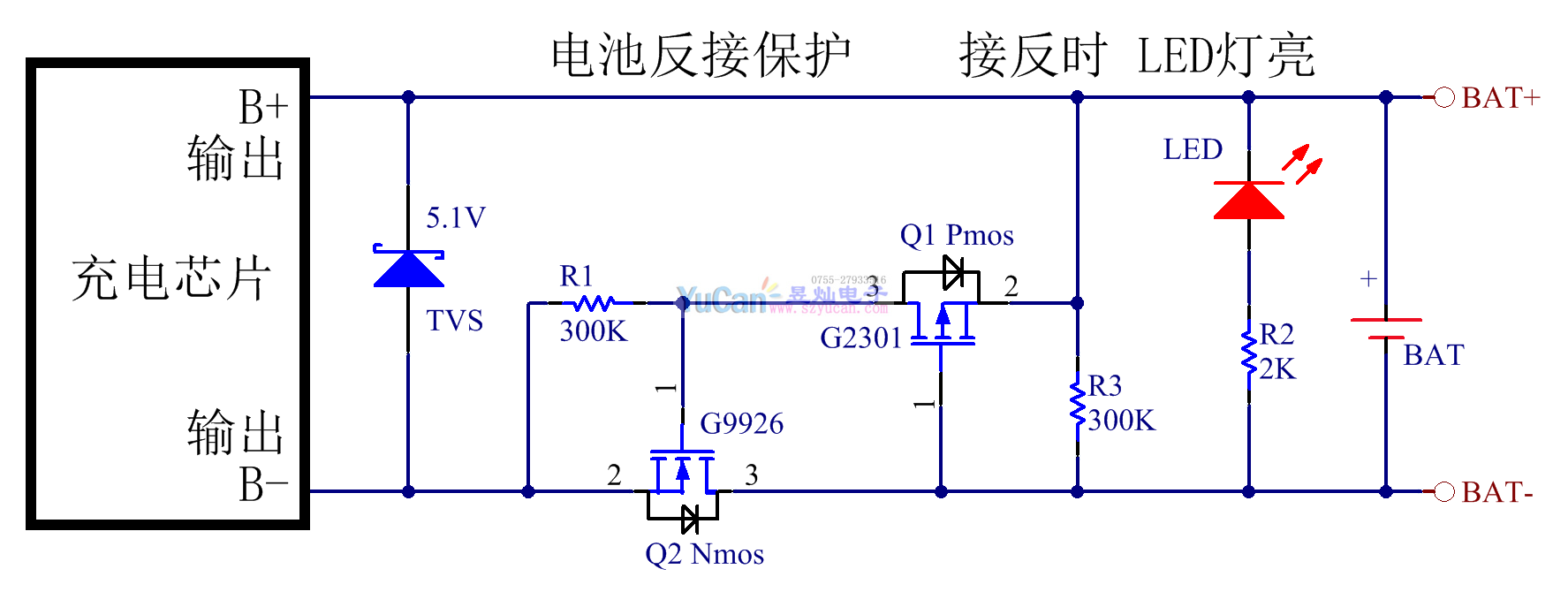 2:電池接反,Pmos柵極正壓降,Pmos截止,Nmos柵極被R1拉低,Nmos截止,LED上負(fù)下正點(diǎn)亮提示電池反接 ,如不需要提示指示燈可以去掉。