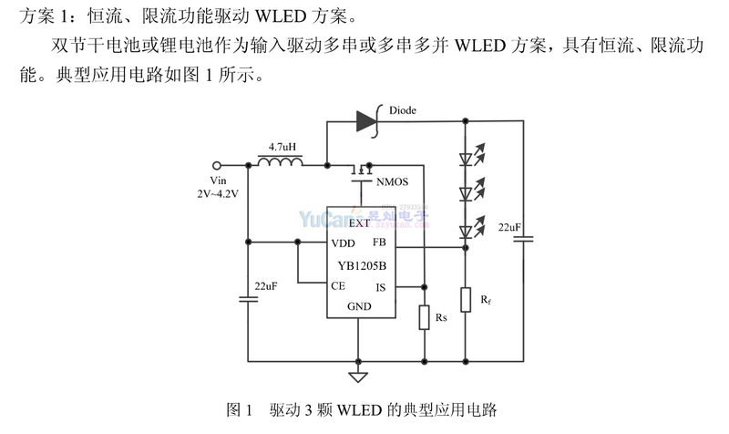 YB1205B是一種輸入電壓范圍寬(0.8~5.5V),可調(diào)恒定電流和限定電流兩種模式來(lái)驅(qū)動(dòng)白光LED而設(shè)計(jì)的升壓型DCDC變換器。采用變頻模式,逐周期限流,使輸入輸出電流隨電源電壓降低均勻變化。該器件能利用單節(jié)或雙節(jié)干電池驅(qū)動(dòng)單顆大功率白光LED,同樣可以利用一節(jié)鋰電池驅(qū)動(dòng)兩顆、三顆或多顆WLED。驅(qū)動(dòng)WLED串聯(lián)連接的方法可以提供相等的WLED電流,從而獲得均勻的亮度