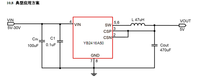 YB2416內(nèi)置線電壓補償,可通過調(diào)節(jié)FB端口的分壓電阻阻值來實現(xiàn).YB2416不僅可實現(xiàn)單芯片降壓電源管理方案,還可以與QC2.0/QC3.0識別芯片構(gòu)成快速充電電源管理方案。另外,芯片包含多重保護功能:過溫保護,輸出短路保護和輸入欠壓/過壓保護等。YB2416采用SOP8的標(biāo)準(zhǔn)封裝。